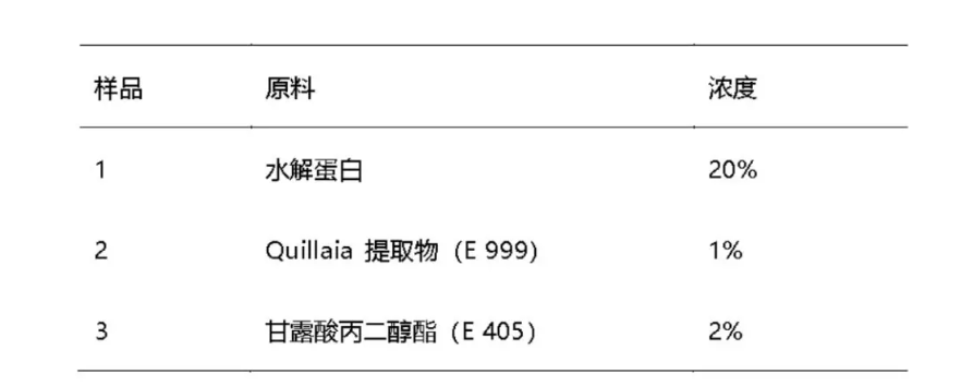 用三种不同的样品进行测试,这些样品在测量之前已经根据用途准备成水溶液(表1)。 这三个样品都是食品中典型的表面活性添加剂。 水解蛋白可用作增味剂,且适用于过敏患者。 Quillaia 提取物用于非酒精饮料中,以支撑泡沫特性,而甘露酸丙二醇酯作为增稠剂,乳化剂或泡沫增强剂存在于冰糕,调味料或啤酒中。