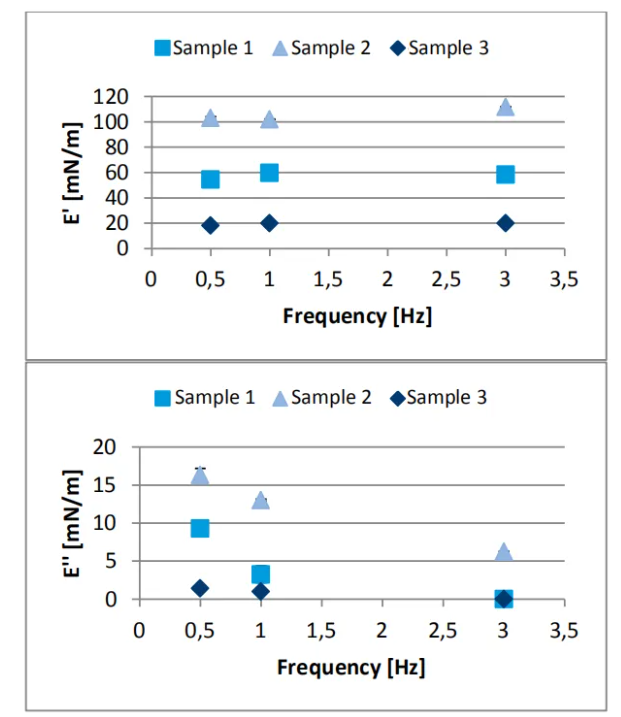 在所有三个样品中,弹性部分主导了界面流变行为(E’>>E”)。在不同的频率下,每个样品的弹性模量变化较小,但是它们彼此之间结果差别很大,其中样品2弹性模量最大,约 100 mN/m。样品 3 的弹性模量最小,约 20 mN/m。随着频率的增加,3 个样品的粘性模量E”均有所降低。