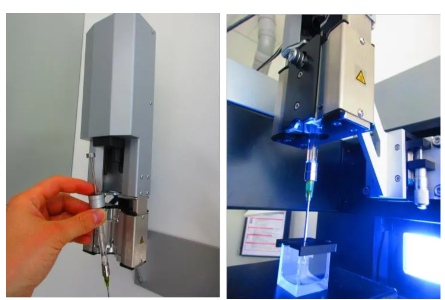 图1: DSA100 振荡滴模块 ODM 的实验装置。 左:装入液体的注射器插入模块中。 右:固定注射器后即可开始测量。
