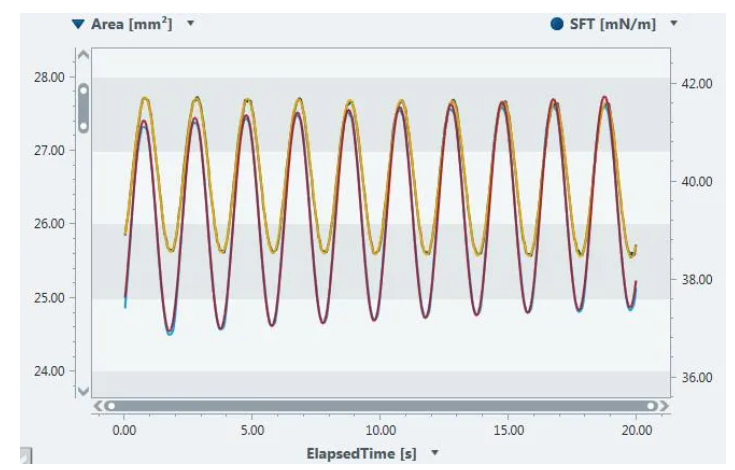 3个样品测得的平衡时表面张力值分别为 37.8、35.5 和53.4 mN/m。图2展示了振荡过程中样品1液滴表面积和表面张力正弦变化过程。ADVANCE 软件可以直观的查看原始数据(蓝色),以及面积(黄色)和表面张力(蓝色)曲线。