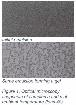 介绍凝胶的获得主要通过两种机理: 通过聚合物的网状物创造一个网络结构(例如明胶),或者通过颗粒的聚集或絮凝形成网络结构(例如酸奶)。在化妆品工业中,经常用凝胶来获得不同的质感,同一个乳液凝胶前后的微观结构也会明显不同,如Figure 1。 对于通过絮凝成型凝胶的乳液体系,液滴之间的相互作用依赖于温